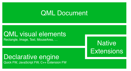 Similar to HTML, QML is a markup language. It is composed of tags, called types in Qt Quick, that are enclosed in curly brackets: Item {}. It was designed from the ground up for the creation of user interfaces, speed and easier reading for developers. The user interface can be enhanced further using JavaScript code. Qt Quick is easily extendable with your own native functionality using Qt C++. In short, the declarative UI is called the front-end and the native parts are called the back-end. This allows you to separate the computing intensive and native operation of your application from the user interface part.
