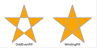Qt Quick Shapes provides two filling rules controlled using the fillRule property of the ShapePath element. The different results are shown in the screenshot below. It can be set to either ShapePath.OddEvenFill, which is the default. This fills each part of the path individually, meaning that you can create a shape with holes in it. The alternative rule is the ShapePath.WindingFill, which fills everything between the extreme endpoints on each horizontal line across the shape. Regardless of the filling rule, the shape outline is then drawn using a pen, so even when using the winding fill rule, the outline is drawn inside the shape.