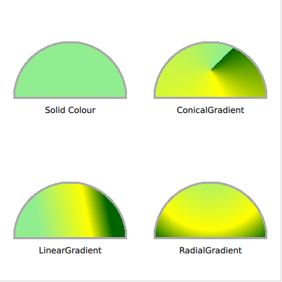 Once the filling rule has been decided on, there are a number of ways to fill the outline. The various options are shown in the screenshot below. The various options are either a solid color, or one of the three gradients provided by Qt Quick.