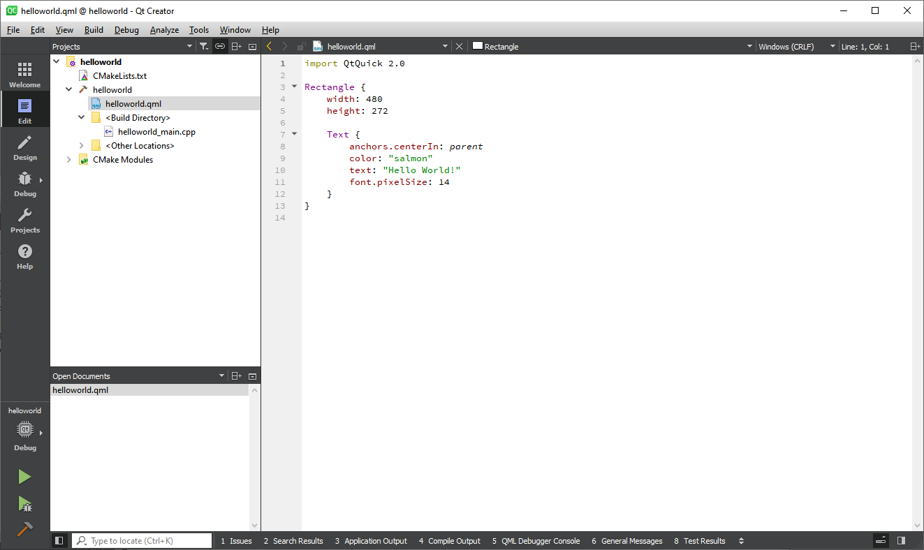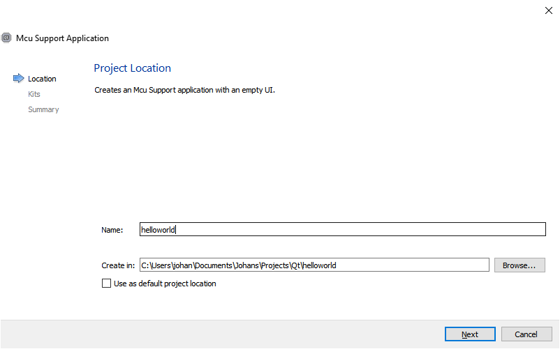 I call the project helloworld. Feel free to pick a name of your own. The only thing changing is the name of the entry-point QML-file of the project.
