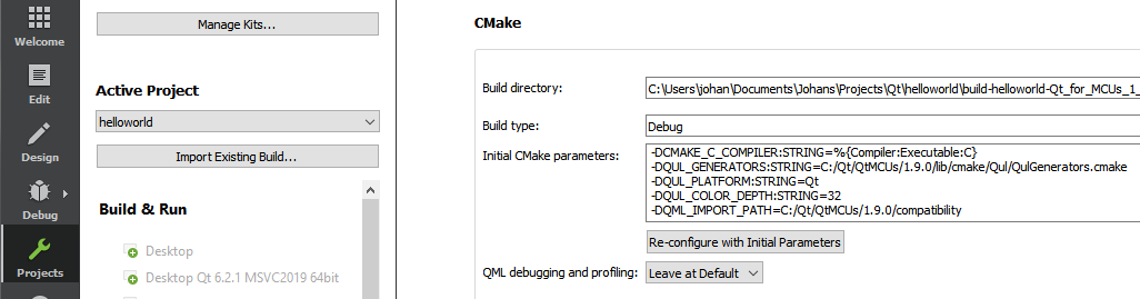 In Qt Creator, you will notice that you get warnings around the StaticText element. This is because Qt Creator assumes that you are working with Qt Quick. To make Qt Creator aware of Qt Quick Ultralite, you need to set the QML_IMPORT_PATH to the path of your Qt for MCUs compatibility module. You can do this in your CMakeLists.txt file, or in your project settings. The project settings for a standard Windows 10 install is shown below.